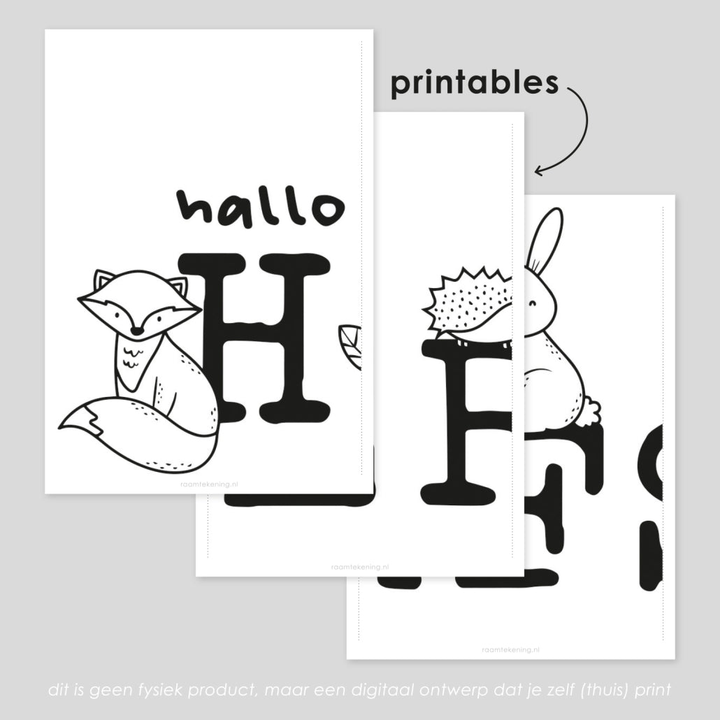 Hallo herfst bosdiertjes raamtekening met vosje, egel, konijn en blaadjes en eikeltje. Een zoete raamdecoratie in het kleurrijke seizoen in te luiden.