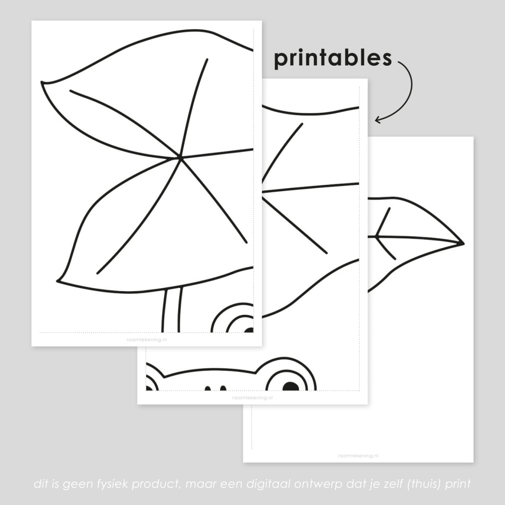 Ondanks de illustratie, zou ik niet aanraden om de kikker met blad-paraplu raamtekening in de regen te gaan tekenen ;)