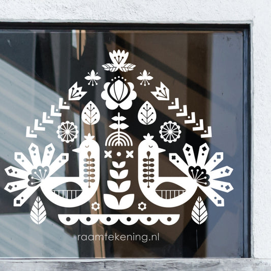 De stilistische pauw en bloemen raamtekening staat gaaf op je raam op élk moment van het jaar.