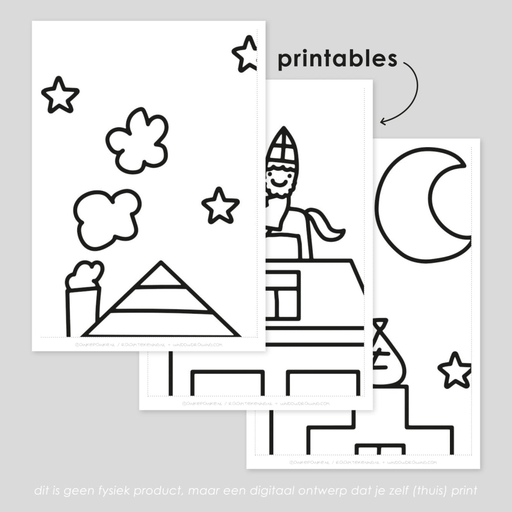 Wie hoor ik daar op het dak lopen? Sinterklaas en Ozosnel komen kadootjes brengen! Tel af en geniet samen van 5 december met deze lieve Sint huisjes raamtekening.